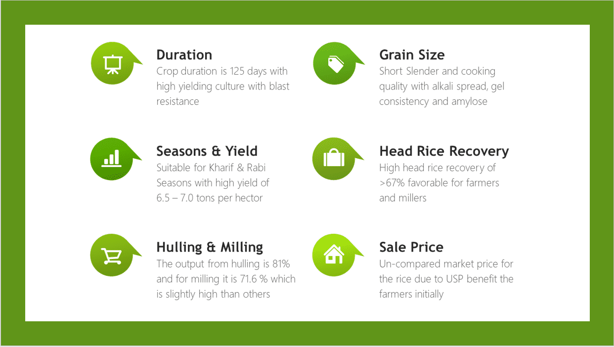 According to secretary (Agriculture) B. Janardhan Reddy, the paddy variety produces short slender grains, has less broken rice percentage, good head rice recovery and high yield potential, making it a premier variety for farmers to grow. From the perspective of millers, Telangana Sona leads to less broken grain (wastage) after milling and makes it a better product to use.
